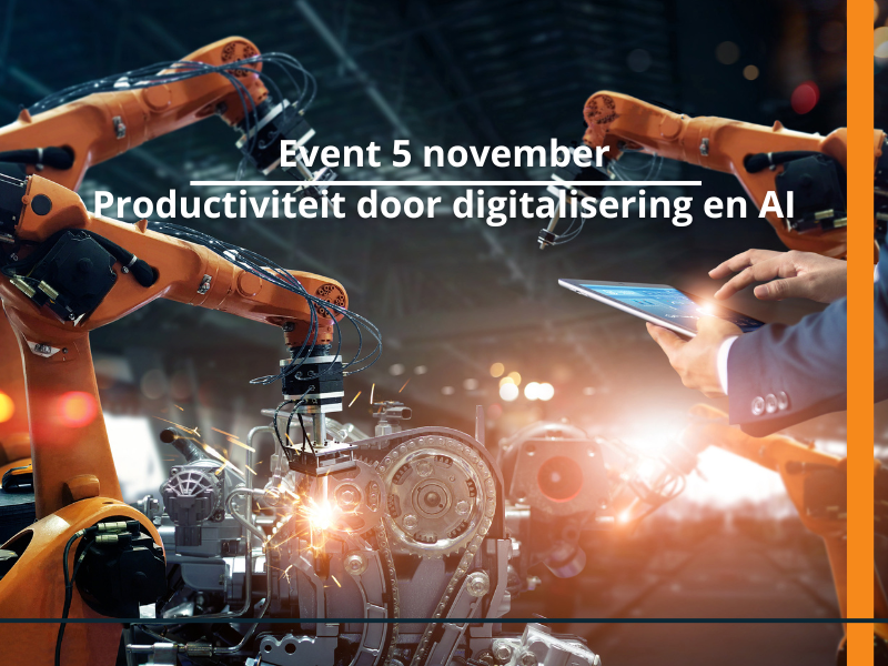 Event - Productiviteit door digitalisering en AI5 november 2025 | Event | productiviteitDigitalisering en kunstmatige intelligentie bieden volop kansen voor de maakindustrie. Maar hoe vertaal je deze technologieën naar concrete verbeteringen in jouw bedrijf? Tijdens het Smart Industry event op 5 november 2025 laten wij zien hoe je de productiviteit kunt verhogen met digitale oplossingen en AI-toepassingen.